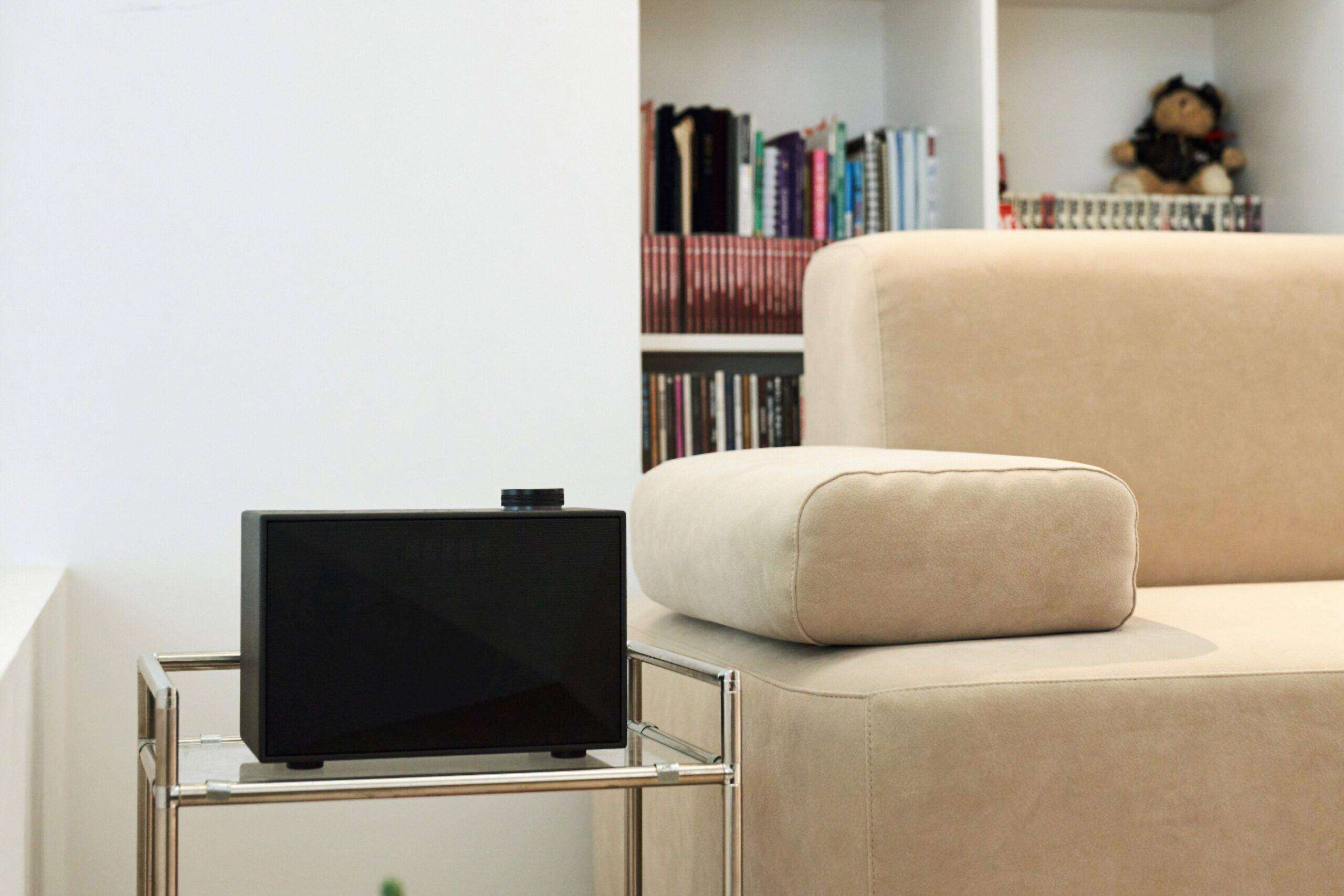 - The premium faux leather exterior of the main unit is complemented by the triangular shapes of the grille mesh, and the volume can be fine-tuned with the touch of a finger on the top aluminum knob’s knurling pattern.