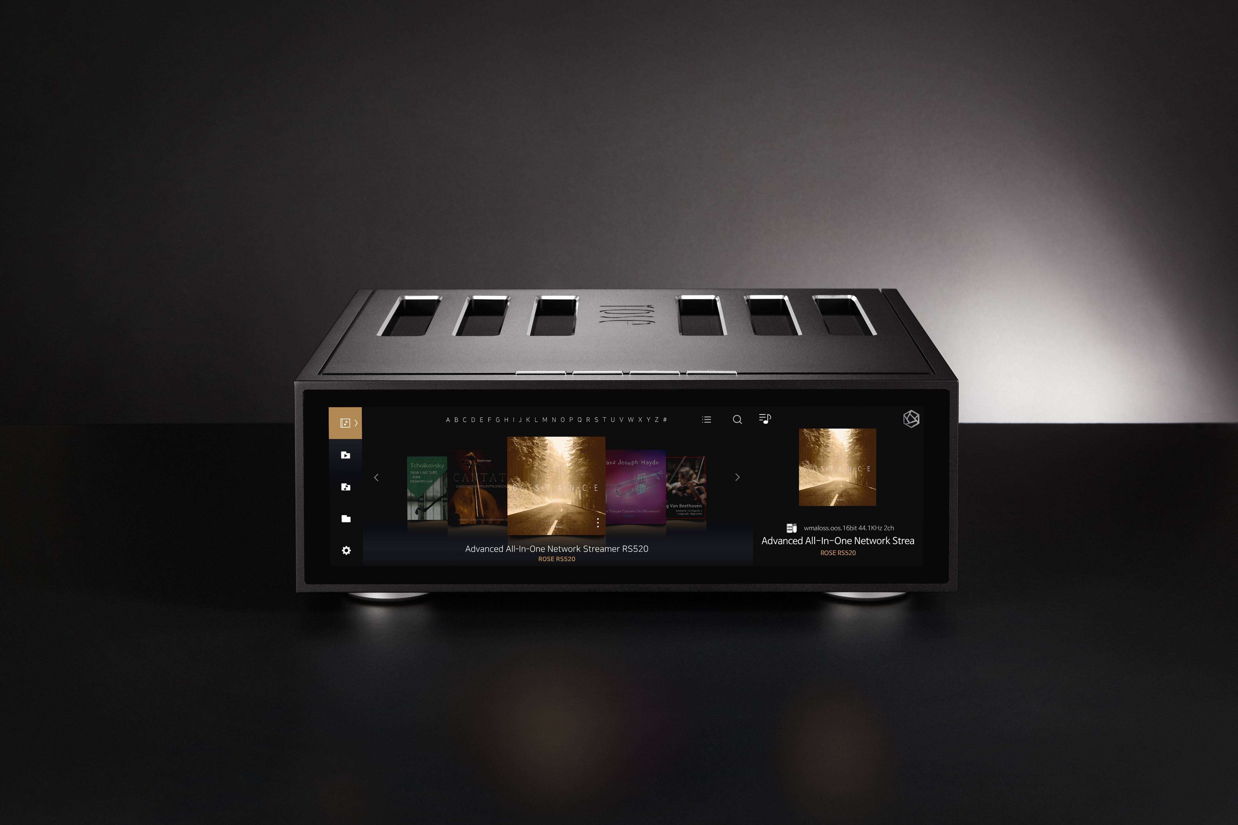 The 12.6-inch, 1920×515-resolution LCD panel on the front of the RS520 makes it easily distinguishable as a Rose streamer. You can take full command of your listening experience thanks to its crystal-clear display and fluid, enjoyable interface. The RS520’s top surface also houses the device’s primary transport controls for quick and easy access.