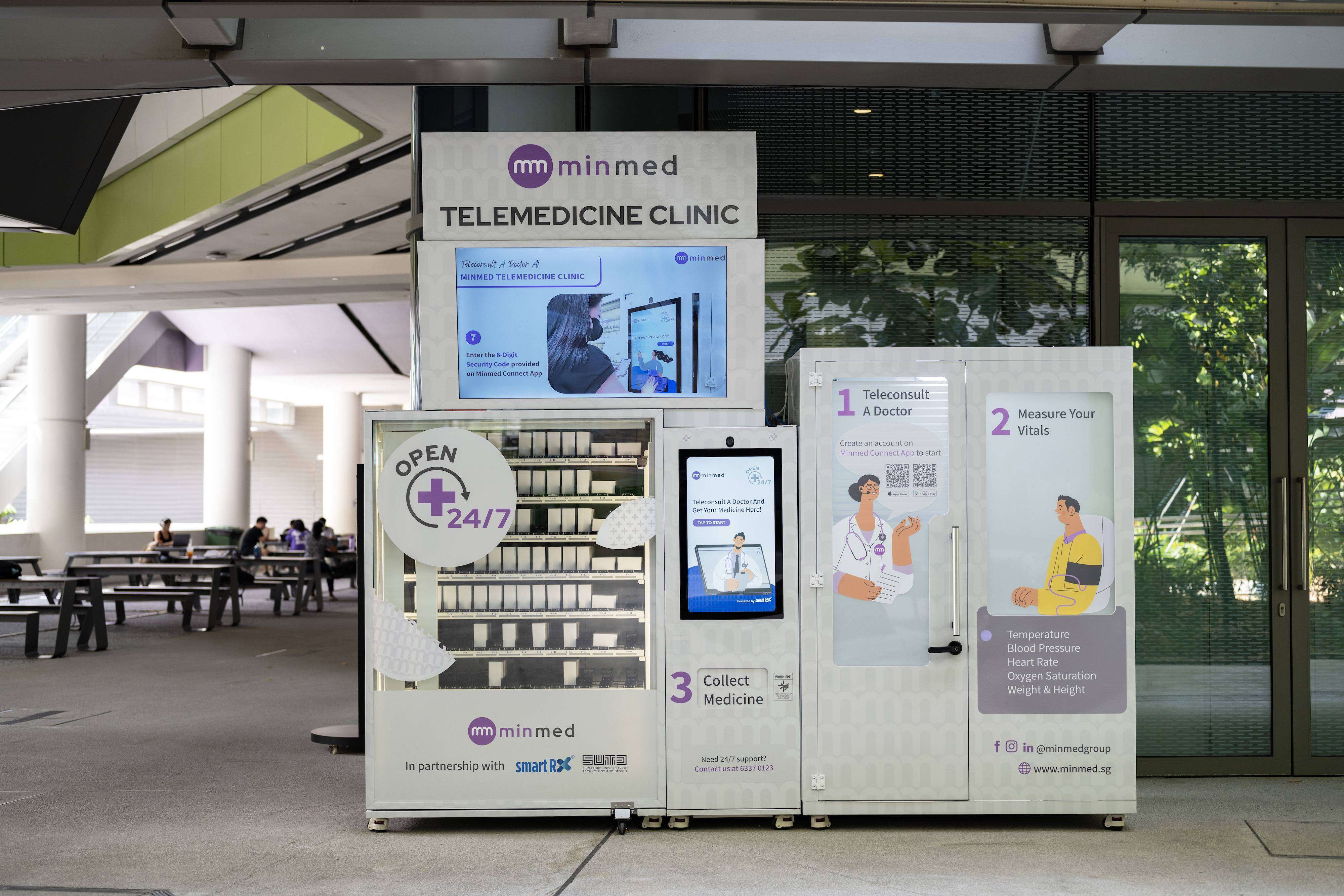The Minmed Telemedicine Clinic draws on SmartRx technology to give university staff, students, and neighboring residents tele-consultation with Minmed doctors, along with prescription drug dispensing services round the clock.
